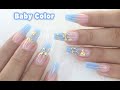 eu vou puxando para Ponta é camuflada são unha toda um mês quando com a outra parte colorida que foi feita aí vocês podem usar qualquer cor de esmalte em gel ou então de pó acrílico como ela queria um azul mais clarinho então fiz assim E aí a gente já pode remover o monte adesivo a e vocês vão remover a goma com álcool Oh e vamos começar a fazer o lixamento E aí para lixar Essa unha vocês primeiro vão deixar a ponta ela quer o formato b ailarina então eu deixo essa parte da ponta bem quadradinha